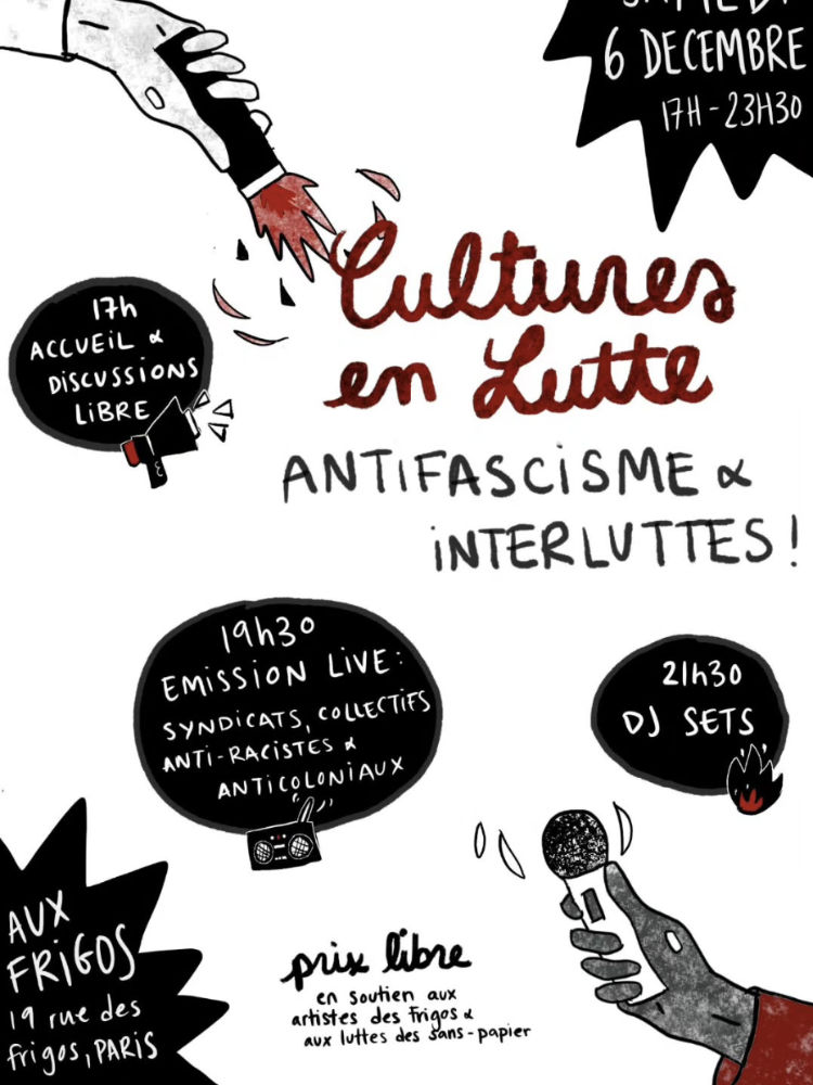 Samedi 6 décembre aux Frigos (19 rue des Frigos, Paris 13) une soirée est organisée autour de l’émission en live de Culture en Lutte IdF.
