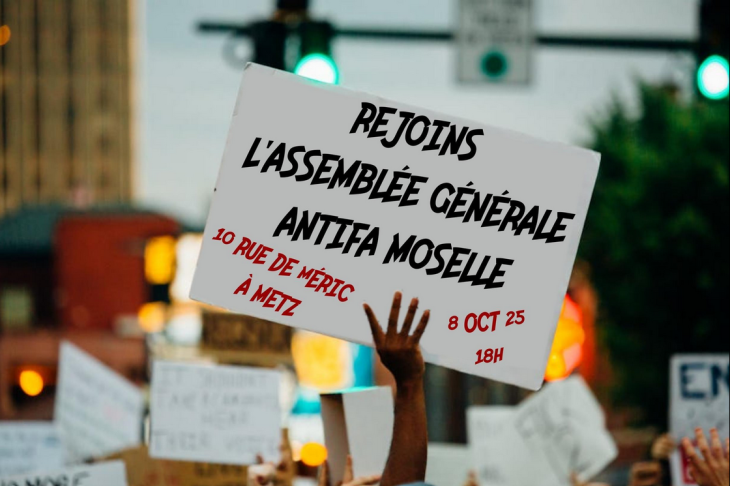 Nous vous invitons à nous rejoindre à la prochaine AG antifa 57 qui aura lieu le mercredi 8 octobre à partir de 18h au 10 rue de Méric à Metz.