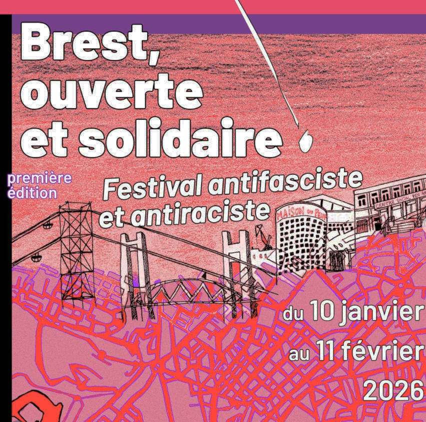 Du 10 janvier au 11 février 2026 aura lieu la première édition de Brest, Ouverte et Solidaire, un festival antifasciste et antiraciste organisé par différents collectifs pour rassembler autour des valeurs fortes de l’antiracisme, de l’antifascisme et de la solidarité à un moment où les idées de l’extrême droite sont de plus en plus présentes. Pendant un mois, habitant·es, associations, collectifs, artistes et curieux·ses sont invité·es à se mobiliser collectivement pour faire vivre fièrement ces valeurs afin de pousser des réflexions et d’imaginer des passerelles, des réponses collectives et solidaires face au fléau que représente l’extrême droite et le fascisme. Pour participer au financement du projet, cliquez ici.