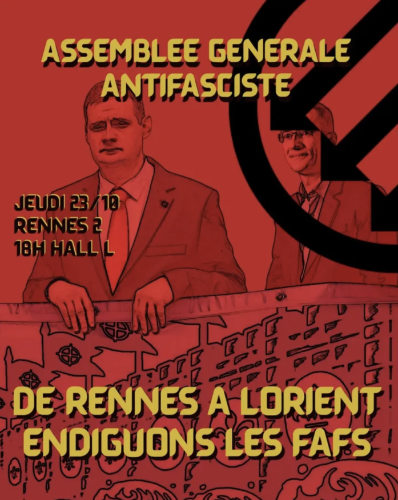 Au vu de l’actualité chargée en idées nauséabondes et en fafillions en tout genre, l’Assemblée Générale Antifasciste propose de se réunir le jeudi 23 octobre à 18h, à Rennes 2 hall L.