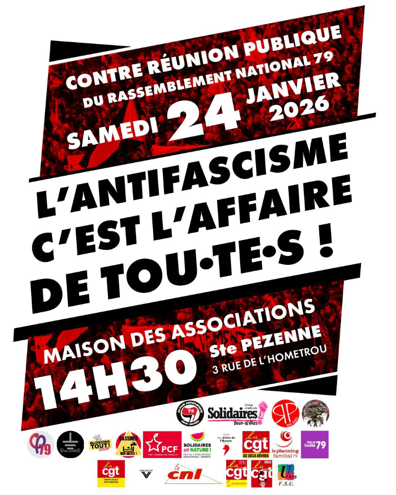 Action Antifasciste Deux-Sèvres 79, Révolution Permanente Deux-Sèvres 79, Solidaires 79, Union Locale - CGT - Melle 79, La France Insoumise 79 - LFI 79, Débloquons Tout 79, Nous Toutes 79, Planning familial 79, CGT 79 Deux-Sèvres, LDH 79, Solidaires par nature, Bassines non merci, Soulevement de la Terre - Sèvre Niortaise, PCF 79 - Parti Communiste Français fédération des Deux-Sèvres, CGT SYENSQO Melle, Collectif 5 (Arts Plastiques citoyens), La Confédération nationale du logement 79, FSU 79, CGT IMA 79, UL CGT du Pays Niortais
