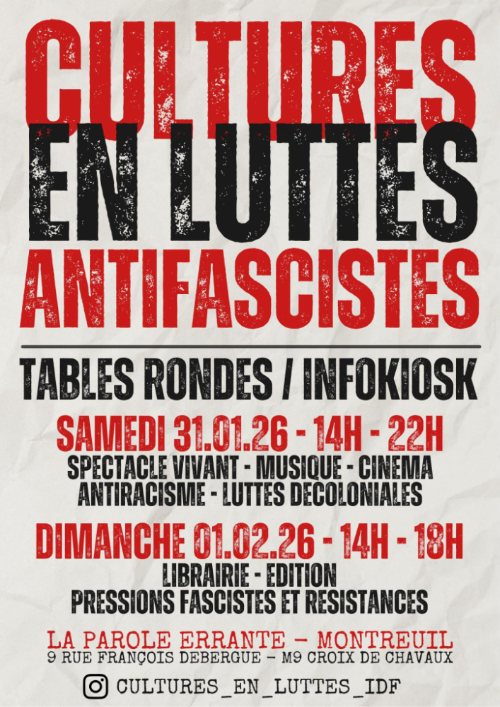 Cultures en luttes organise à la Parole Errante (Montreuil) un week-end antifasciste avec de nombreuses tables rondes sur des thèmes aussi variés que l’occupation du terrain culturel face à l’extrême droite ou les attaques et les pressions sur le monde du livre.