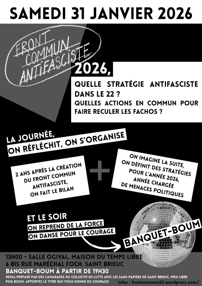 Pour imaginer la stratégie, l’organisation concrète et les actions en commun l’année 2026 qui s’annonce lourde de menaces (municipales 2026, attaques impérialistes, renforcement de groupuscules fascistes dans d’autres villes bretonnes, instabilité politique qui ouvre des possibilités au RN, etc) mais aussi de possibilités de renforcer notre camp : Quelles actions en commun ? Quels objectifs et quel moyens on se donne ? Comment se renforcer mutuellement dans les actions que l’on mène ? Quelle est la forme d’organisation la plus pertinente ?