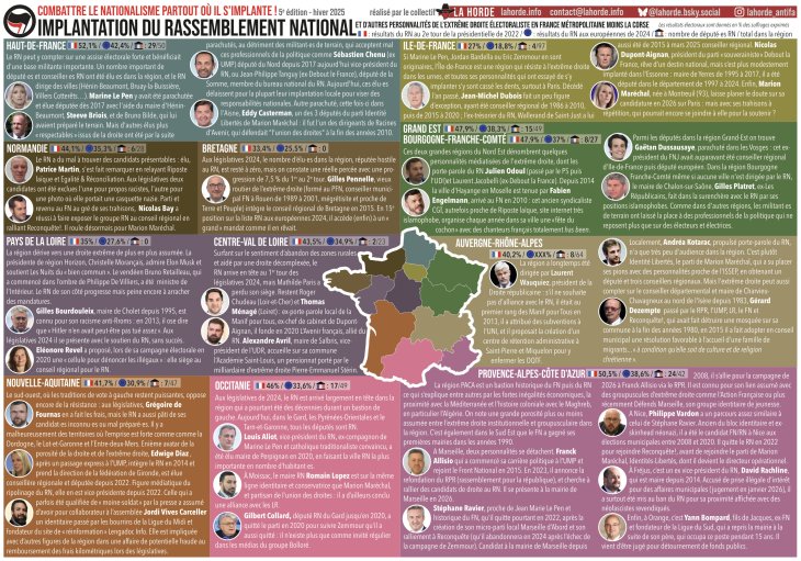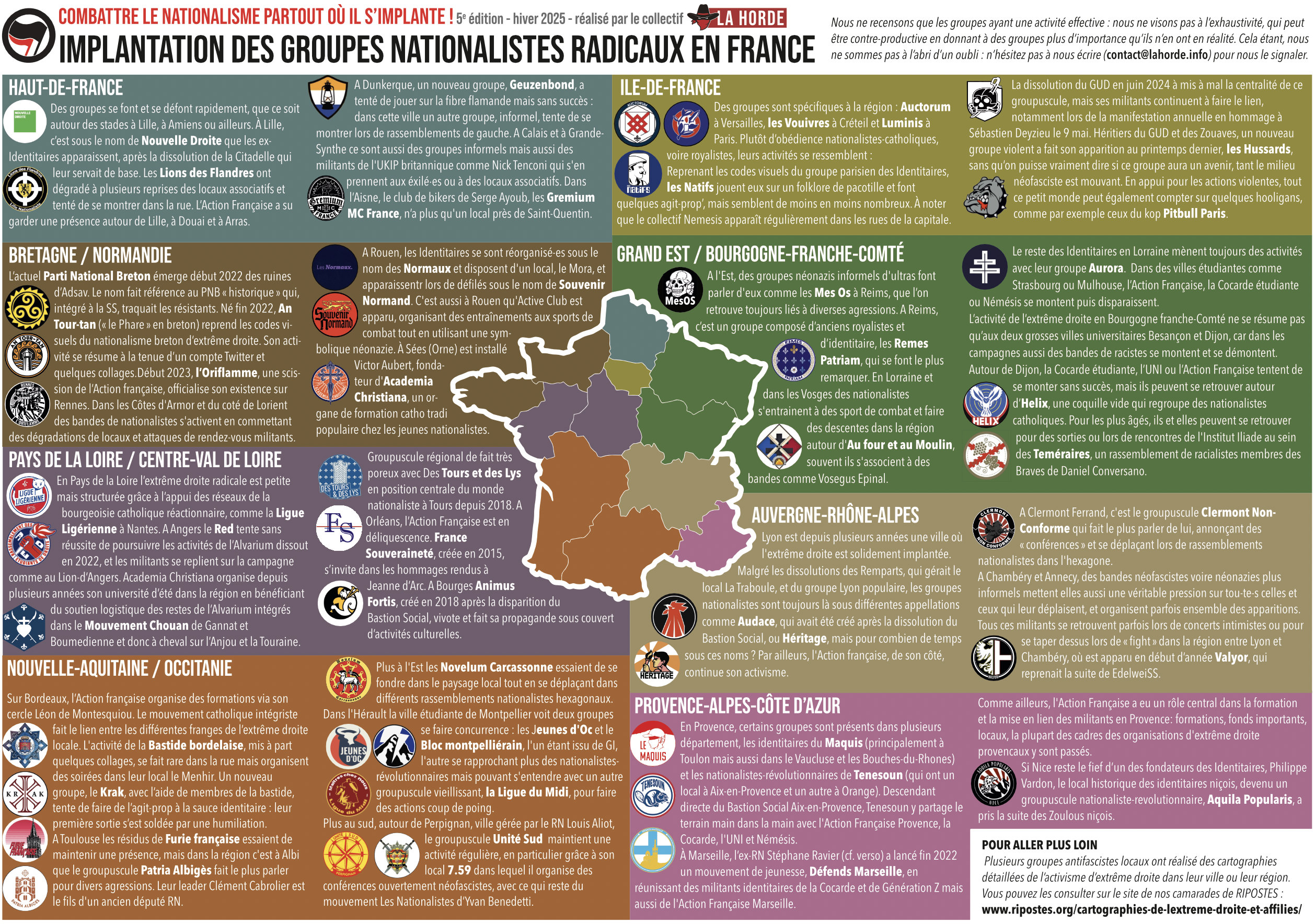 Alors que des organes de la presse bourgeoise (Libé) et indépendante (Streetpress) proposent, chacun à leur façon, des cartes des groupes d’extrême droite, reprenant ce que nous avions commencé à faire dès 2022, nous avons réfléchi à ce qu’une nouvelle version de la nôtre pourrait apporter. Nous avons garder l’idée d’un document qui puisse être imprimé et partagé facilement, mais en proposant deux cartes distinctes : d’une part les groupes radicaux locaux et d’autre part le RN et les autres partis ou personnalités d’extrême droite institutionnelle. Le but n’est pas de viser l’exhaustivité, mais au contraire de proposer une sélection afin de permettre une vision la plus claire possible sur la situation présente.