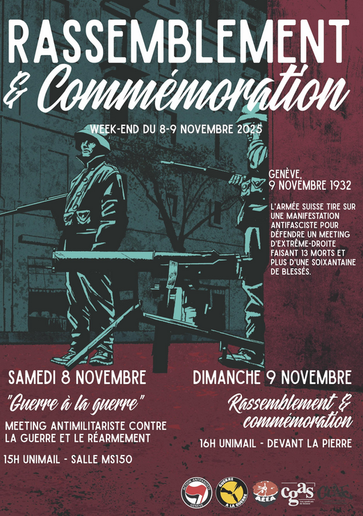 En souvenir de la répression meurtrière du 9 novembre 1932 contre une manifestation antifasciste à Genève, l’Action Antifasciste Genève organise un week-end antifasciste et antimilitariste avec un meeting "Guerre à la Guerre" le 8 novembre et un rassemblement le 9.