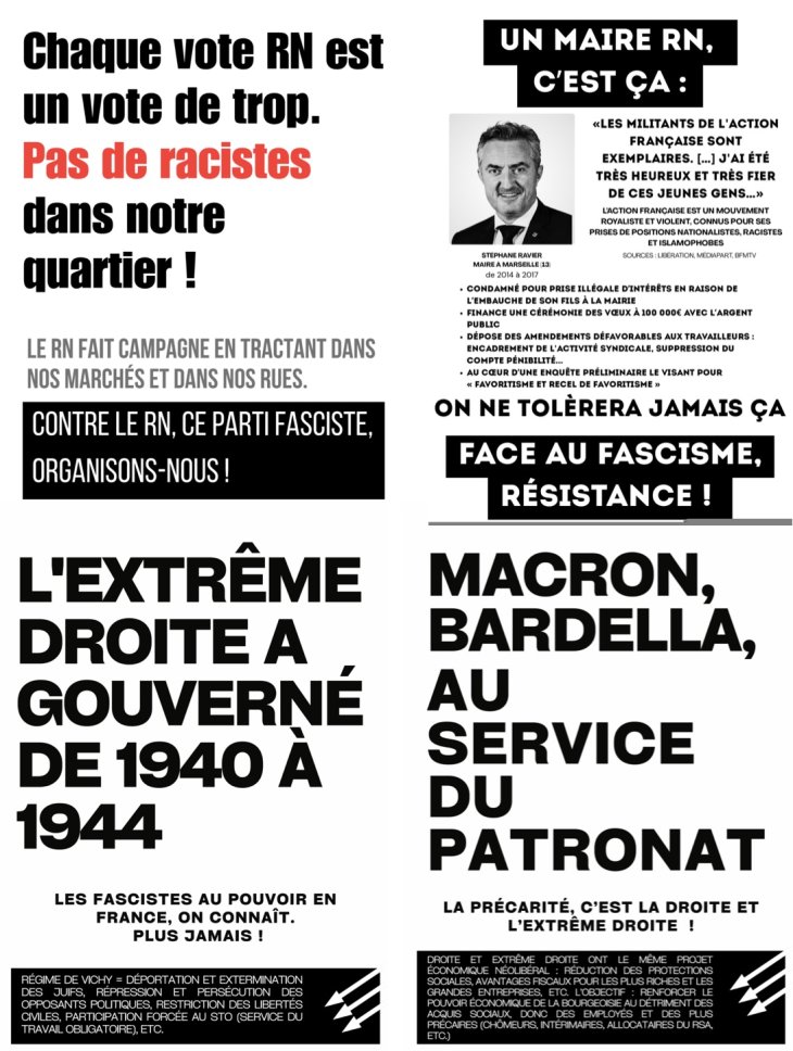 Nous sommes en train de mettre en place une plateforme sur laquelle on peut mettre des brochures, des tracts et des methodes pour que n’importe qui, n’importe où, puisse recouvrir chaque sticker et chaque affiche des candidat-e-s de ce parti, être présent-e-s à chaque tractage et à chaque meeting pour rappeler que nos villes et nos villages sont et resterons antifascistes et antiracistes.