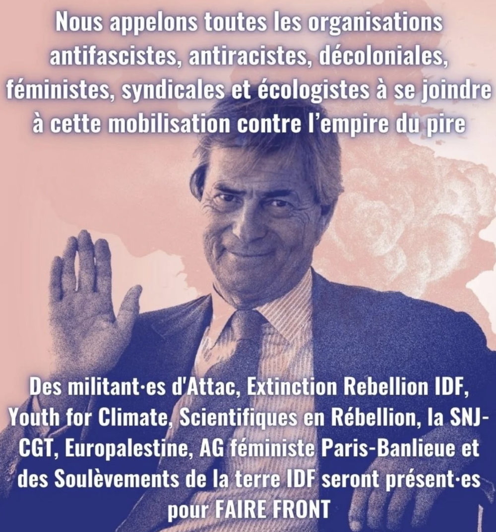 Nous appelons toutes les organisations antifascistes, antiracistes, décoloniales, féministes, syndicales et écologistes à se joindre à cette mobilisation contre l’empire du pire. Des militant-es d’Attac, Extinction Rebellion IDF, Youth for Climate, Scientifiques en Rébellion, la SNJ-CGT, Europalestine, AG féministe Paris-Banlieue et des Soulèvements de la terre seront présent-es pour faire front.