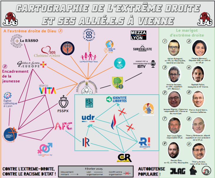 Les Patriotes (des militants du FN qui ont suivi Florian Philippot, le vice-président du FN, lors de sa rupture avec Marine le Pen en 2017) ont présenté un candidat aux législatives en 2022 : Jean-Louis Goujon (1,62% des voix). Voulant quitter l’Union européenne comme l’ont fait les Britanniques, ce parti milite essentiellement pour le « Frexit ». Les militants tentent vainement d’exister ; ils ont trouvé un peu d’entrain en s’associant aux anti-vax, ou bien en se greffant sur les mobilisations paysannes. L’ Union Populaire Républicaine est dirigée par François Asselineau. Ce parti se présente comme « souverainiste », très anti-américain et surtout très ouvert aux thèses conspirationnistes. En 2017, Véronique Barrow était candidate aux législatives (1,10%). Elle est encore candidate aux européennes en 2024 (0,96 % en Isère). Groupe politique qui ne se présente plus aux élections, l’Action Française apparaît ponctuellement sur la ville. Quelques autocollants, une vente de leur journal devant l’église de Pipet, quelques posts sur les réseaux et une réunion clandestine dans un appartement privé.