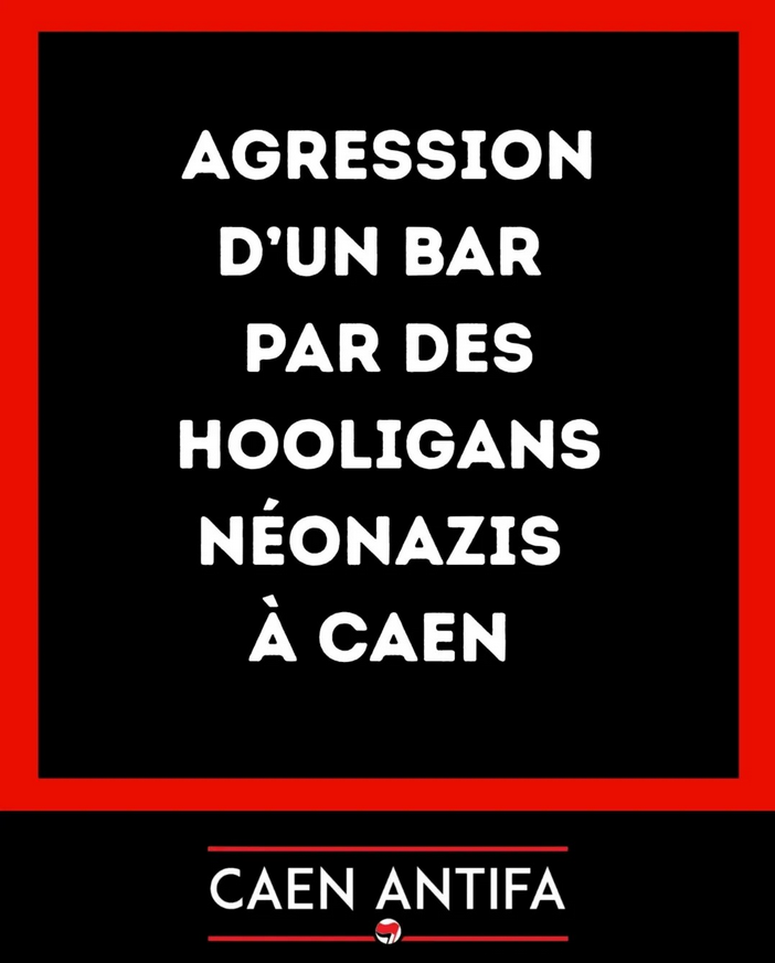 Dans la soirée du 21 au 22 mars à Caen, après un match de football au cours duquel les hooligans caennais avaient été renforcés par leurs amis nazis du Mans et de Brest, un bar associatif de la ville à été ciblé par une attaque.