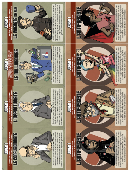 Fachorama est constitué de 40 cartes au format 80*120 : afin d’en faire tenir 4 sur une feuille A4, nous avons conservé les proportions mais réduit les dimensions, les cartes faisant ici 65*97, soit un tout petit peu plus grand que des cartes de poker : il est donc possible de les coller sur un jeu existant.