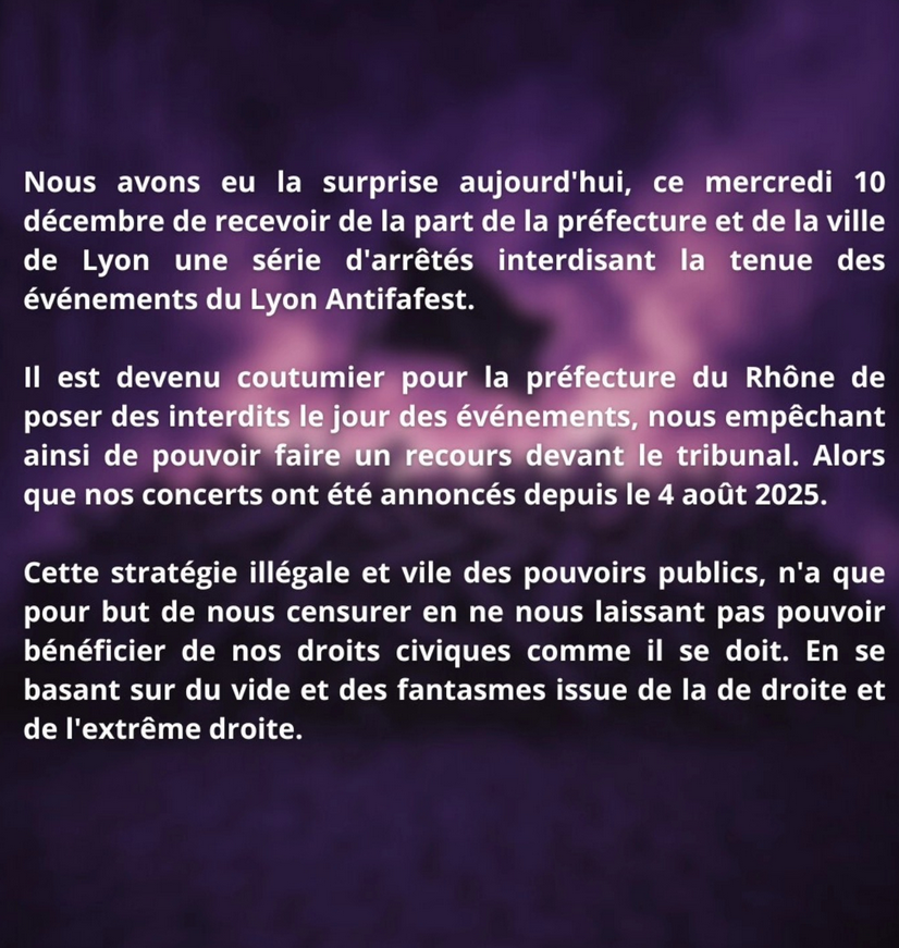 Communiqué du Lyon Antifa Fest, la préfète du Rhône fait interdire les quatre dernières soirées du Lyon Antifa Fest :