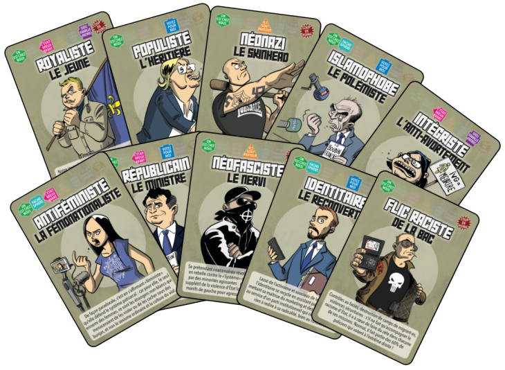 FACHORAMA est un jeu de cartes, qui se veut un outil pédagogique visant à montrer de façon ludique que l’extrême droite a bien des visages, et que si ses partisan·tes ont de nombreux points communs, iels ont aussi leur singularité. Le but du jeu ? demander aux autres joueurs et joueuses des catégories de fafs, les regrouper par famille et faire le plus de familles possible !