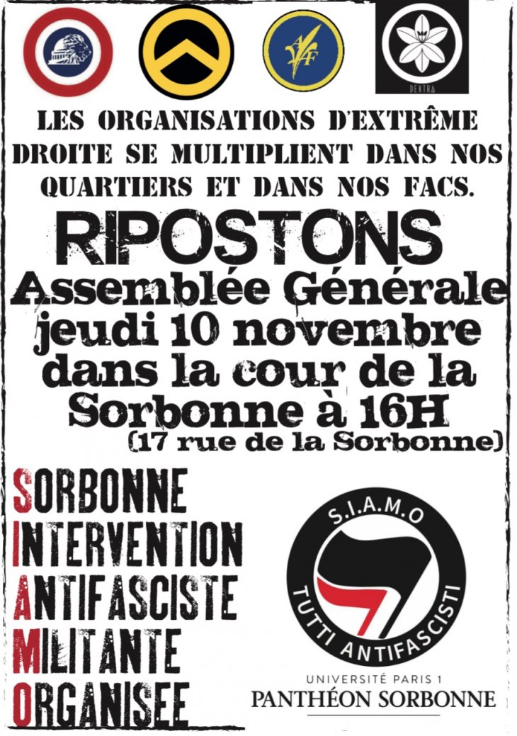 Le collectif antifasciste SIAMO s’est constitué à la rentrée à l’université Paris IV, mais entend bien assurer une présence antifasciste au-delà de la fac, dans tout le quartier latin : voici un compte-rendu de leur première assemblée publique place de la Sorbonne.