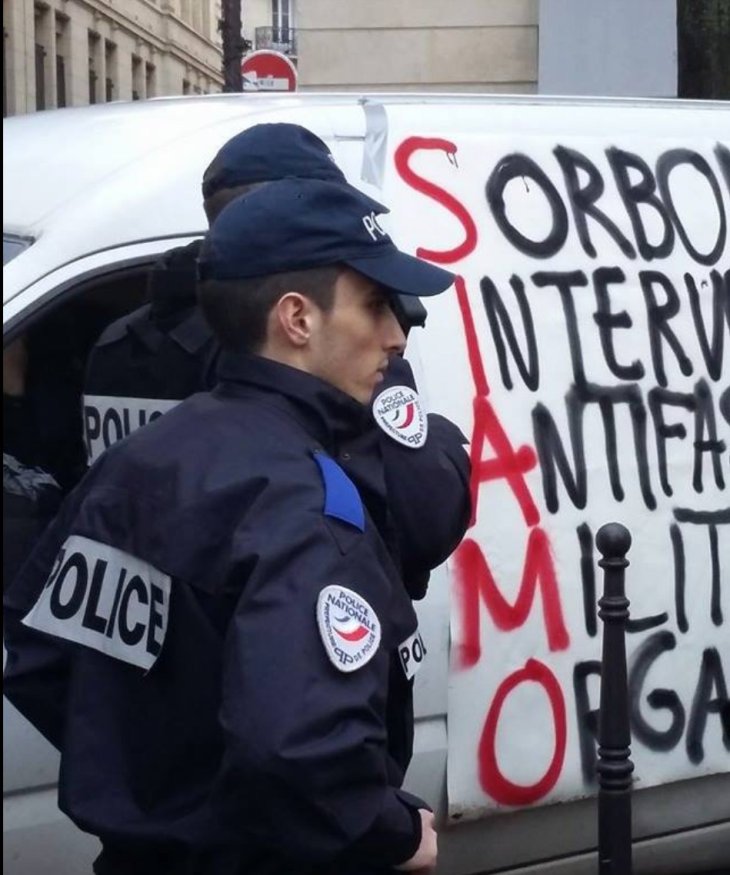 De bonne grâce, nous avons accepté de déplacer l’AG sur la place de la Sorbonne, c’est-à-dire hors de l’université, jugeant qu’il était plus important de pouvoir rencontrer tout le monde plutôt que de nous enfermer dans une fac qui nous empêche de nous réunir. Cependant, à peine rassemblé.e.s, nous avons eu la visite de plusieurs agents de police, G36 à la main, qui ont insisté pour surveiller l’AG, comme si nous étions de dangereux criminels potentiels. Sans doute une mesure antiterroriste de plus que nous devons à l’état d’urgence qui fêtera dans deux jours sont premier anniversaire.