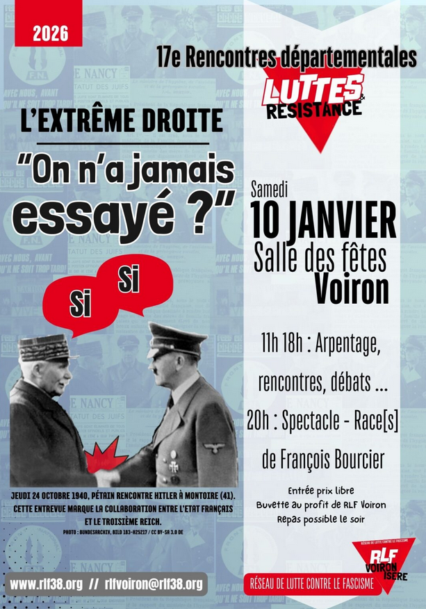 Pour cette 17e édition, le Réseau de Lutte contre le Fascisme (RLF) Voiron propose une journée de rencontres, d’échanges et de réflexion autour d’un thème central et brûlant d’actualité : L’extrême droite : “On n’a jamais essayé ?”