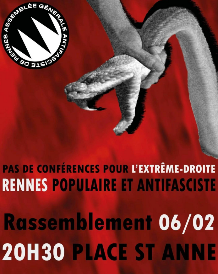L’Assemblée Générale Antifasciste appelle à reprendre la rue et à se retrouver pour une manifestation antifasciste vendredi 6 février à 20h30 à St-Anne. Pour une déambulation festive dans l’hyper centre, au menu : tractage, collage et discussions !