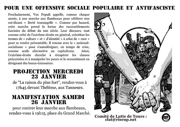 Prochainement, Vox Populi appelle, comme chaque année, à une marche aux flambeaux pour célébrer une soi-disant « fierté tourangelle ». Comme par hasard, cette marche prend la forme des rassemblements fascistes du début du 20e siècle. Leur discours, tout comme celui de l’extrême droite en général, substitue les termes de « culture » et « d’identité » à celui de « race » pour se rendre présentable. Il renoue avec le « national-socialisme » pour s’autodésigner, en temps de crise, comme seule alternative au capitalisme. Ainsi, l’extrême droite cherche à récupérer les classes précarisées et à manipuler les peurs et le ressentiment en désignant des boucs-émissaires.