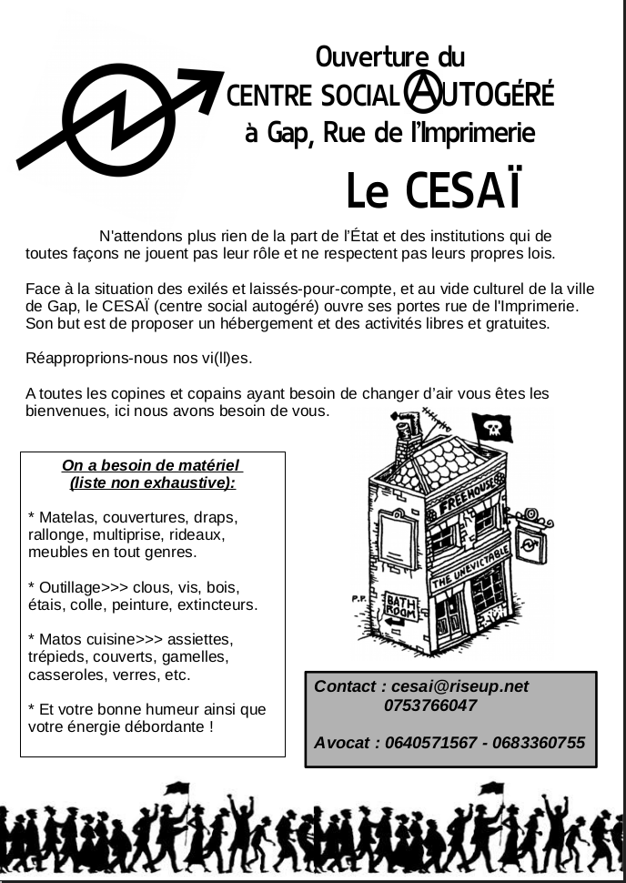 N’attendons plus rien de la part de l’État et des institutions qui de toutes façons ne jouent pas leur rôle et ne respectent pas leurs propres lois. Face à la situation des exilés et laissés-pour-compte, et au vide culturel de la ville de Gap, le CESAÏ (centre social autogéré) ouvre ses portes rue de l’Imprimerie. Son but est de proposer un hébergement et des activités libres et gratuites. Réapproprions-nous nos vi(ll)es. A toutes les copines et copains ayant besoin de changer d’air vous êtes les bienvenues, ici nous avons besoin de vous.