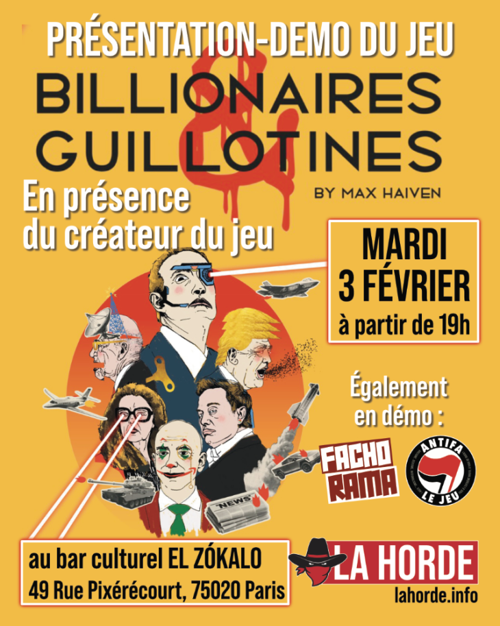 Présentation (avec traduction) de Billionaires & Guillotines en présence du créateur du jeu, Max Haiven, organisateur du symposium "What is the Antifascist Game ?" En juillet dernier à Londres, auquel nous avions participé. Rendez-vous mardi 3 février à partir de 19h au bar culturel El Zókalo (49 Rue Pixérécourt, 75020 Paris).