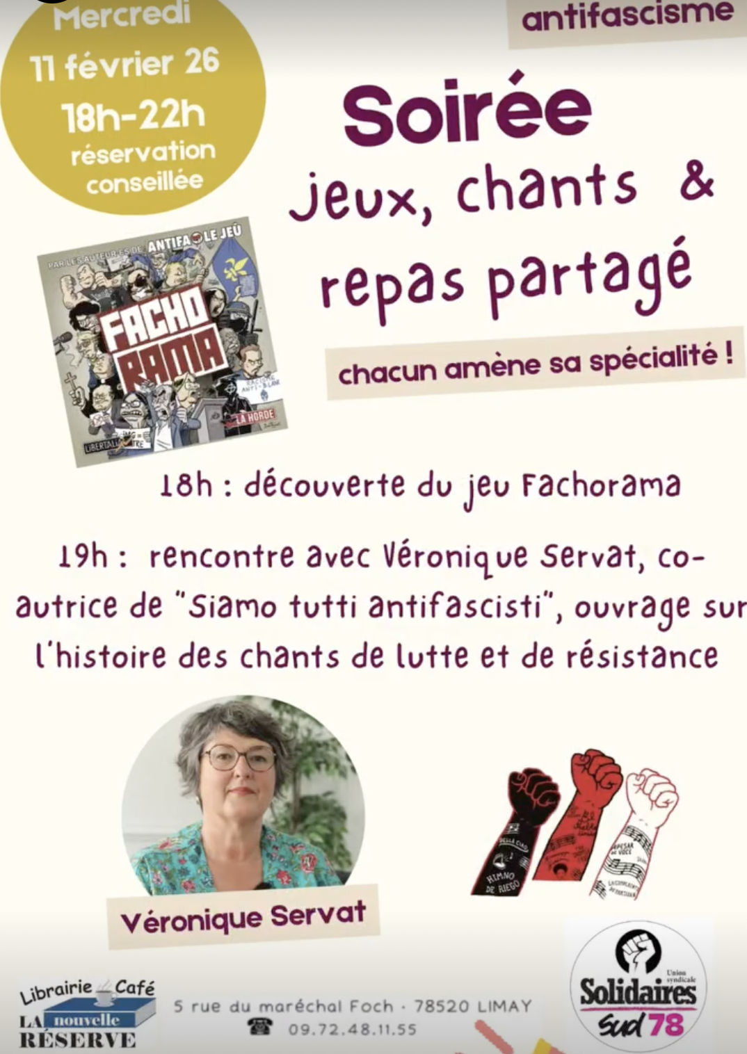 La librairie-café coopérative La Nouvelle Réserve organise une soirée jeux et chants mercredi 11 février de 18h à 22h, avec une découverte du jeu Fachorama suivi à 19h d’une rencontre avec Véronique Servat, coautrice de "Siamo tutti antifascisti", ouvrage sur l’histoire des chants de lutte et de résistance. Rendez-vous à la librairie 5 rue du maréchal Foch à Limay. Vous pouvez aussi soutenir la librairie ici