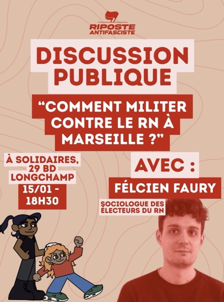 Dans le cadre des AG de mobilisation contre le RN, jeudi 15 à 18h30 à Solidaires, Riposte antifasciste accueille Felicien Faury, sociologue du vote RN, pour discuter et réfléchir à contrer un argumentaire RN et se donner de la force pour les tractages.