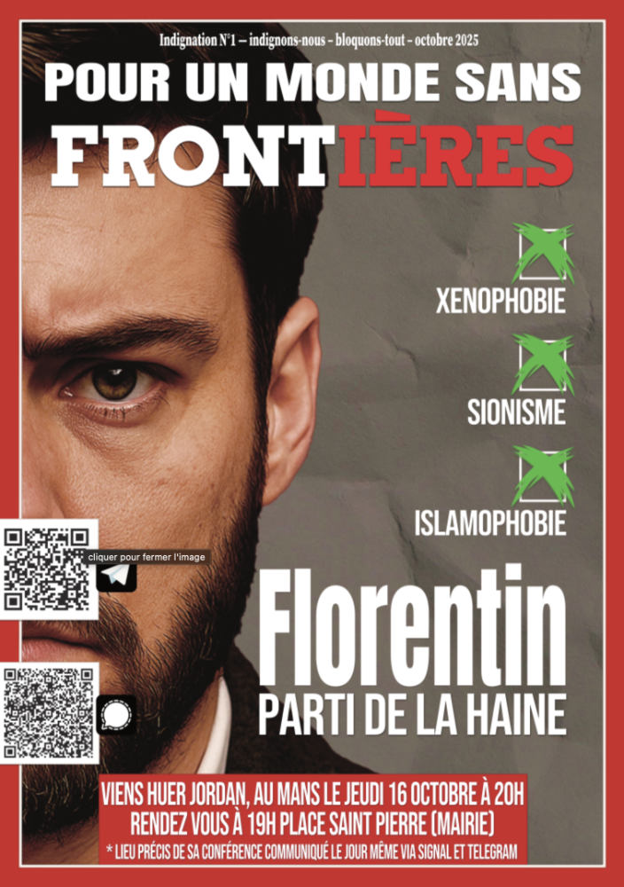 L’Assemblée Générale antifasciste de la Sarthe appelle à se rassembler jeudi 16 Octobre à 19h place Saint-Pierre, au Mans, devant la mairie, pour protester contre la venue du rédacteur en chef du média d’extrême droite Frontières, à l’invitation de l’association Les discussions du Maine.