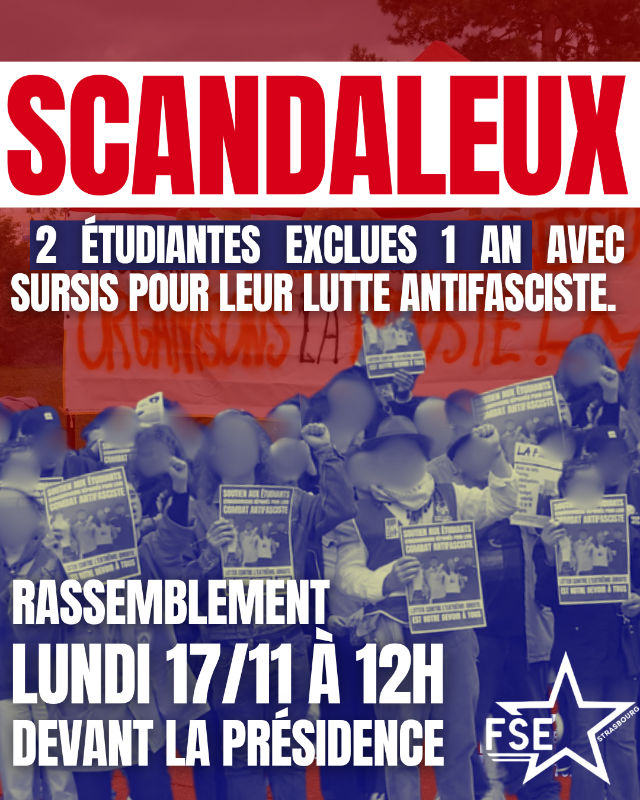 Le FSE, syndicat étudiant, appelle à se rassembler ce lundi à 12h devant la Présidence de l’Université de Strasbourg pour clamer leur opposition à la répression injuste qui touche deux étudiantes antifascistes. Voici leur communiqué.