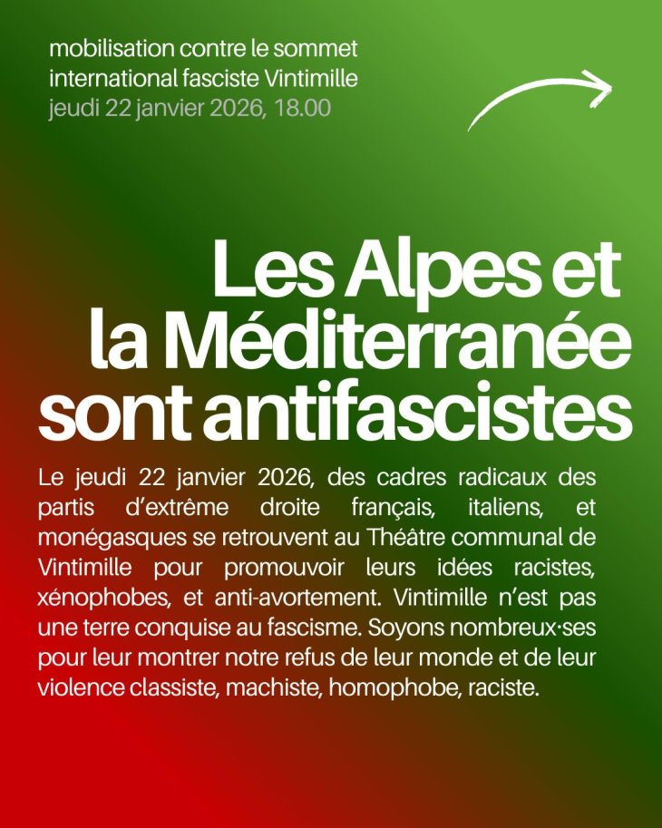 Le jeudi 22 janvier 2026, des cadres radicaux des partis d’extrême droite français, italiens, et monégasques se retrouvent au Théâtre communal de Vintimille pour promouvoir leurs idées racistes, xénophobes, et anti-avortement. Vintimille n’est pas une terre conquise au fascisme. Soyons nombreux ses pour leur montrer notre refus de leur monde et de leur violence classiste, machiste, homophobe, raciste. Un appel à se mobiliser contre ce sommet a été lancé : rassemblement le 22 janvier à 18h. Les Alpes et la Méditerranée sont antifascistes !
