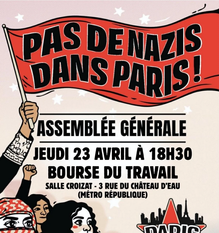 Assemblée générale pour organiser la manifestation antiraciste et antifasciste du 9 mai, rendez-vous le 23 avril à 18h30, à la Bourse du travail de Paris, salle Croizat, 3 rue du Château d’Eau, Metro République.