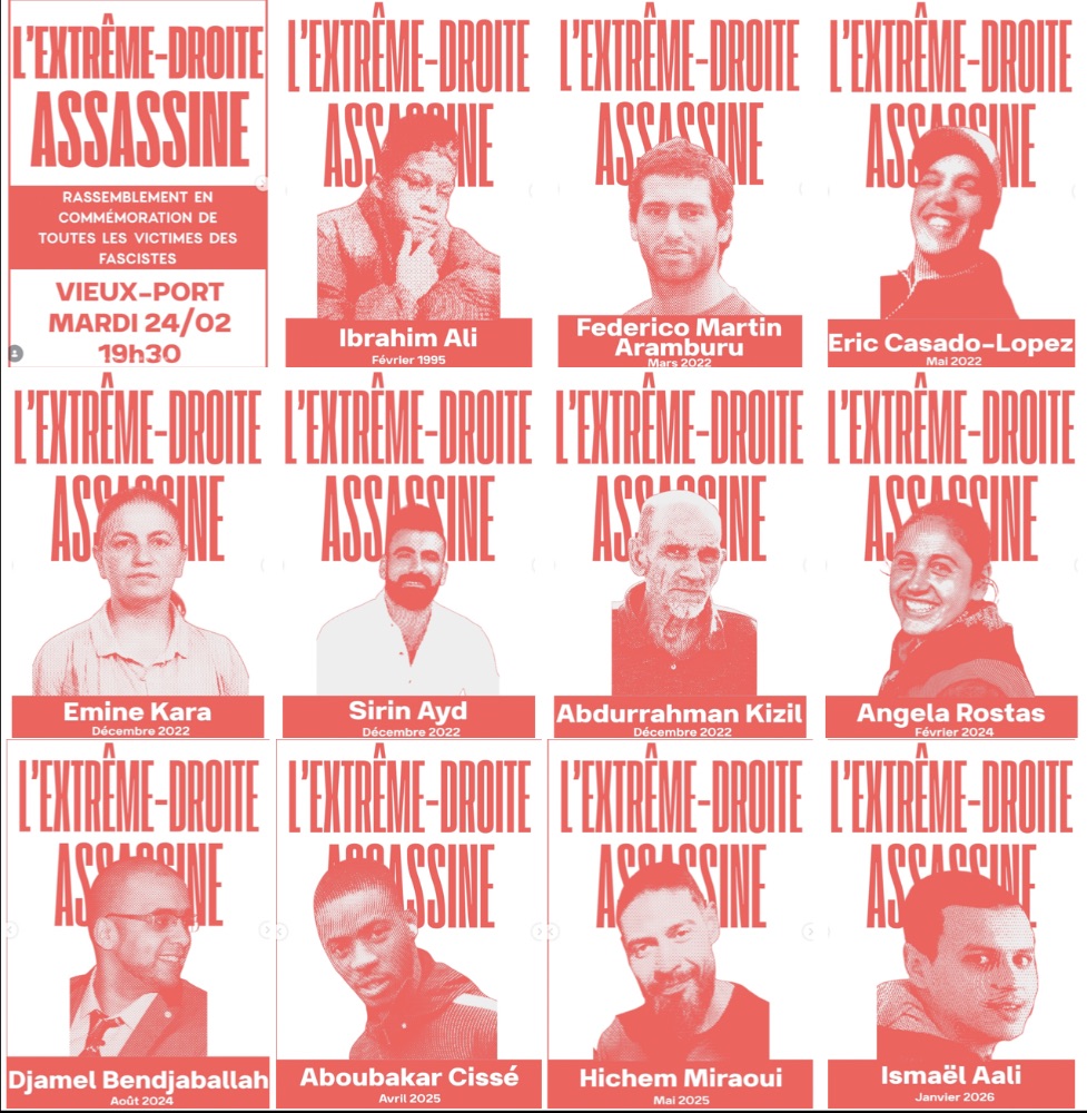 Riposte antifasciste appelle à un rassemblement/marche aux flambeaux mardi 24 février à 19h30 sous l’ombrière du vieux port afin de commémorer toutes les personnes assassinées par l’extrême droite.