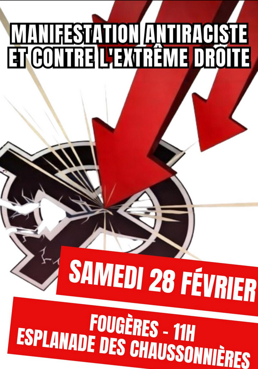 A l’appel de différentes organisations et associations, une manifestation est organisée contre la montée de l’extrême-droite le 28 février esplanade des Chaussonnières à Fougères à 11h.