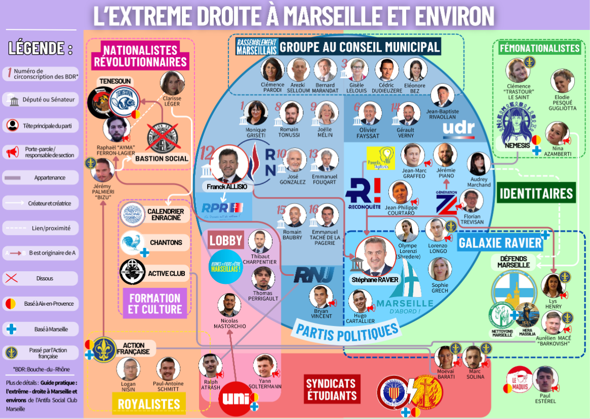 L’objectif de cet outil et de montrer la dynamique globale et les cibles locales, ça reste un outil pratique, qu’on peut afficher chez soi, dans son lieu travail... On peut l’utiliser en complémentarité du guide pratique contre l’extrême droite à Marseille et ses environs, qu’on a écrit en octobre 2024 et qui rentre aussi plus dans les détails.