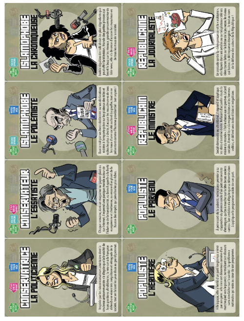 Fachorama est constitué de 40 cartes au format 80*120 : afin d’en faire tenir 4 sur une feuille A4, nous avons conservé les proportions mais réduit les dimensions, les cartes faisant ici 65*97, soit un tout petit peu plus grand que des cartes de poker : il est donc possible de les coller sur un jeu existant.