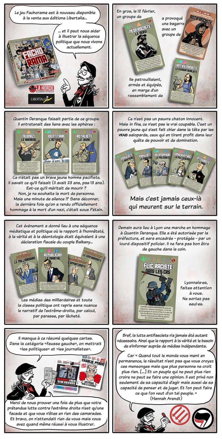 ActualitésL’affaire Deranque vu par Boutanox vendredi 6 mars 2026 Quentin Deranque Partager sur Twitter Partager sur Facebook Imprimer L’illustrateur Boutanox, qui a fait les dessins pour Fachorama, propose une présentation des circonstances de la mort du néofasciste Quentin Deranque à Lyon en février dernier à travers les cartes de notre jeu de société.