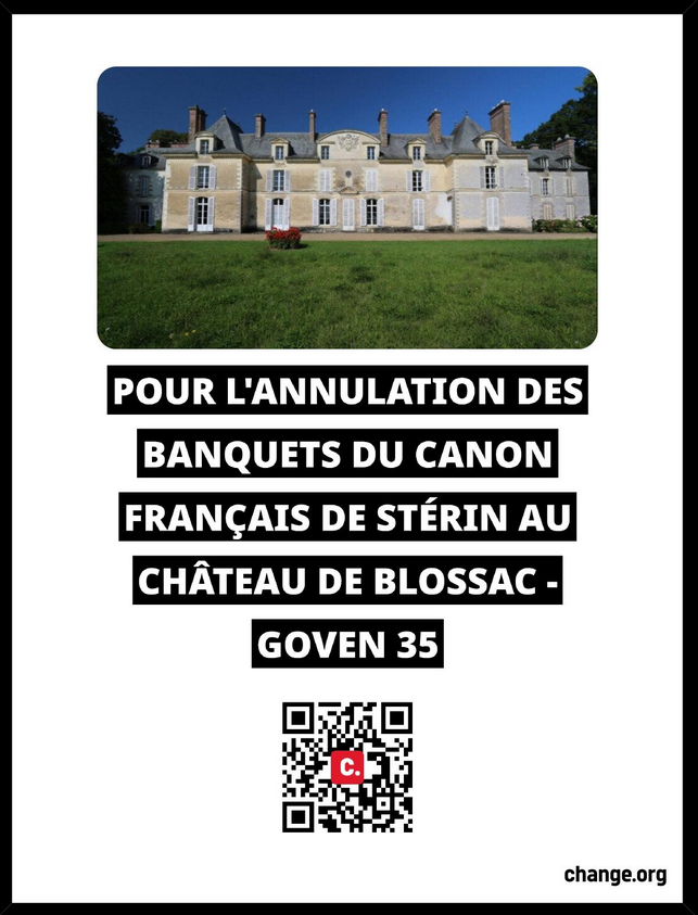 Après la victoire de l’annulation des banquets du Canon Français au Château des Pères à Piré-sur-Seiche par la mobilisation des habitants du territoire [1], Pierre-Alexandre Mortemard de Boisse et Géraud du Fayet de la Tour espèrent maintenir leurs banquets au Château de Blossac à Goven les 7-8-9 Novembre.