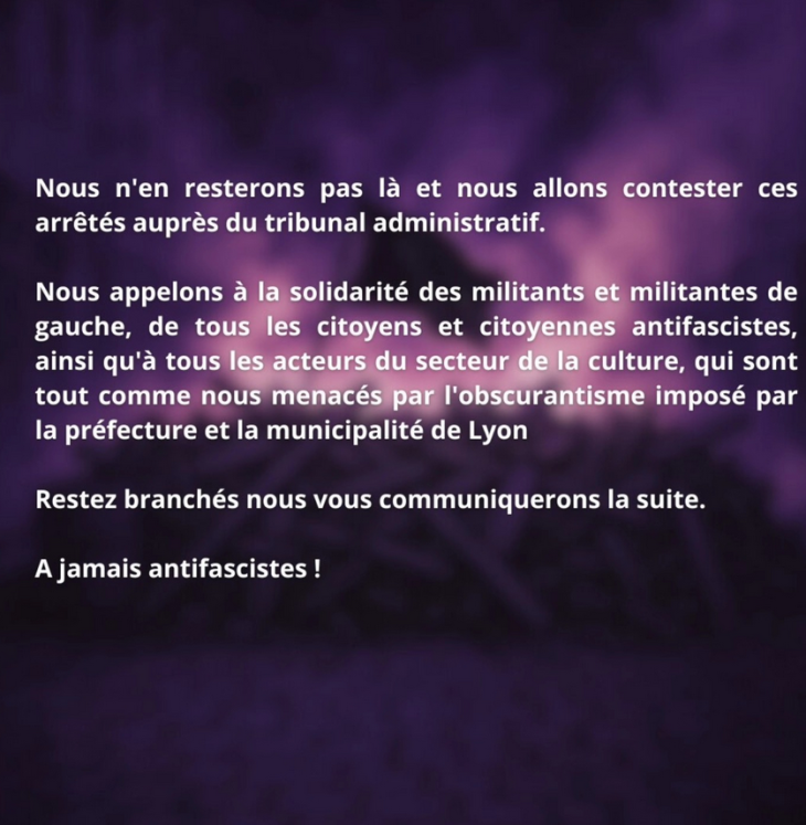 Communiqué du Lyon Antifa Fest, la préfète du Rhône fait interdire les quatre dernières soirées du Lyon Antifa Fest :