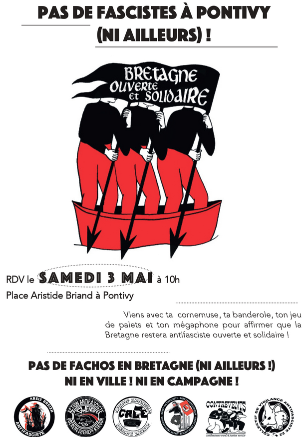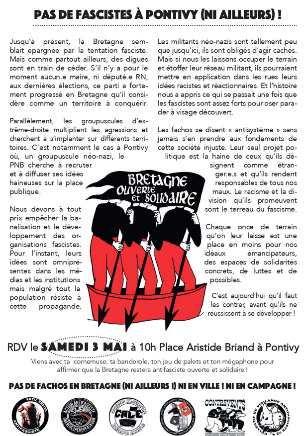 Différents collectifs antifascistes appellent à un rassemblement contre la présence du Parti national breton, rendez-vous le 3 mai à 10h Place Aristide Briand à Pontivy.