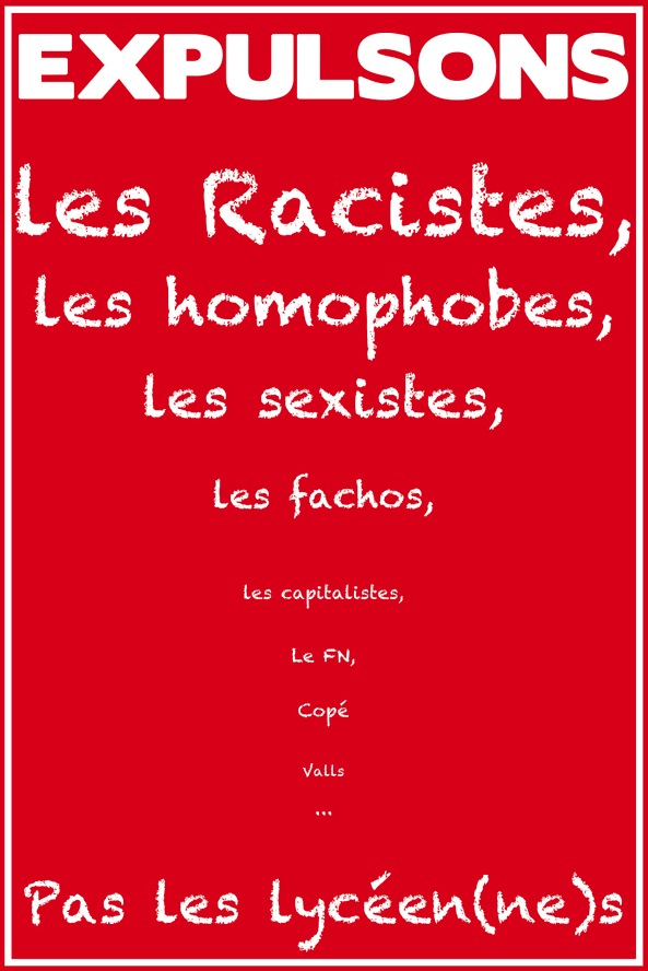 De façon spontanée et autonome (malgré les tentative des organisations lycéennes d’encadrer le mouvement), des milliers de lycéens sont descendus dans la rue cette semaine pour dénoncer le racisme d’État et soutenir la jeune Léonarda et sa famille. Alors que Manuel Valls a expulsé plus de lycéens sans papiers que tous ses prédécesseurs réunis, il est plutôt encourageant de voir que cela entraîne des réactions de solidarité, avant tout par humanisme mais avec aussi une prise de conscience que le Parti socialiste au pouvoir ne mène pas une politique différente de l’UMP quand il s’agit de s’en prendre aux personnes les plus précaires qui essayent tant bien que mal de vivre ici.