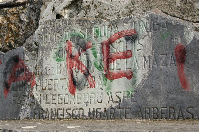 Nous pourrions citer comme cela des dizaines d’exemples montrant que la Transition Démocratique a surtout été un ravalement de façade du régime franquiste mais concentrons notre propos sur un aspect peut-être plus symbolique mais pas moins essentiel de cette démocratisation ratée : les représentations du franquisme dans l’espace public. Là aussi, il serait possible de rapporter les différentes manifestations officielles encensant Franco et ses sbires, comme cet hommage rendu, par la déléguée du gouvernement en Catalogne, aux derniers membres de la Division Azul ; ou encore de cette maire de la région madrilène qui prêta une école de sa ville pour y héberger une exposition rendant hommage aux mouvements fascistes. Mais abordons plutôt les symboles permanents que représentent ces milliers de monuments, d’éléments de décors de bâtiments officiels, de noms de rues qui parsèment le territoire de l’Etat espagnol. Et, plus précisément encore, intéressons-nous à ceux présents en Euskal Herria.