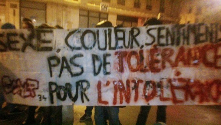:A Montpellier, depuis plusieurs mois, des cercles catholiques intégristes, dénommés les « Veilleurs », organise des prières de rue homophobes les mardi soirs sur la place de la Préfecture, occupant ainsi l’espace public avec leur discours haineux et nauséabond. Ce mardi 08 octobre 2013, des militantes et militants LGBT, dont des militants du SCALP et de l’UEC, se sont opposés à cette prière de rue sauvage, protégée par les forces de l’ordre. Ces manifestations de haine hebdomadaires sont tolérées par la mairie « gay-friendly » de Montpellier. Rappelons que la haine n’est pas une opinion, mais un virus. Et un virus, ça s’élimine.