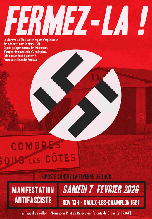 Manifestation antifasciste au coeur de Meuse, contre la taverne de Thor à Combres-sous-les-côtes. Cette action de protestation déterminée et accessible à toutes celles et ceux qui s’opposent à l’implantation d’un réseau international néonazi dans le département et au-delà.