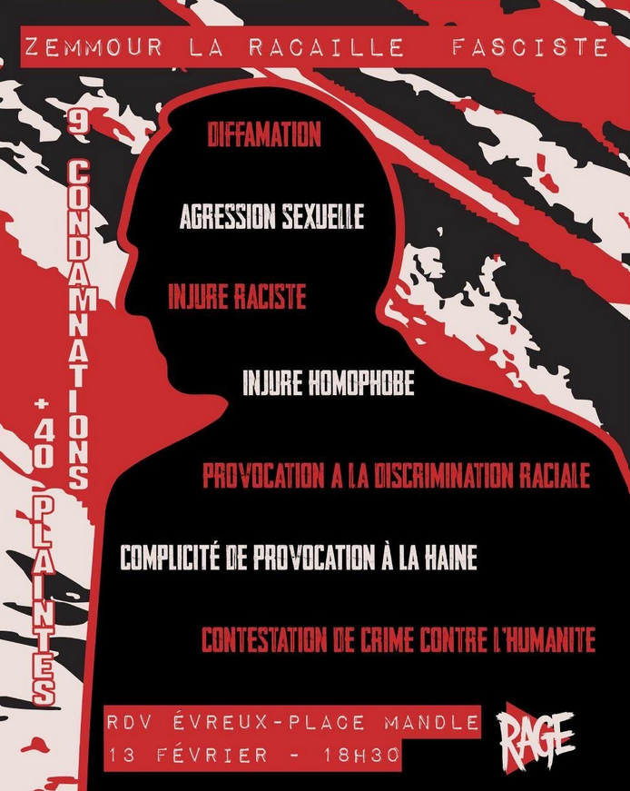 Face à la venue d’Eric Zemmour pour un meeting de soutien à Jean Messiha, rassemblement le vendredi 13 février à 18h30 place Mandle.